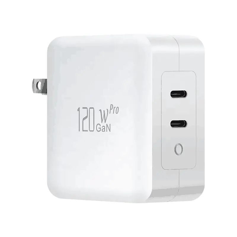 Компактный адаптер быстрой зарядки с двумя портами USB-C, обеспечивающий общую мощность до 120 Вт для ноутбуков, планшетов и других электронных устройств.